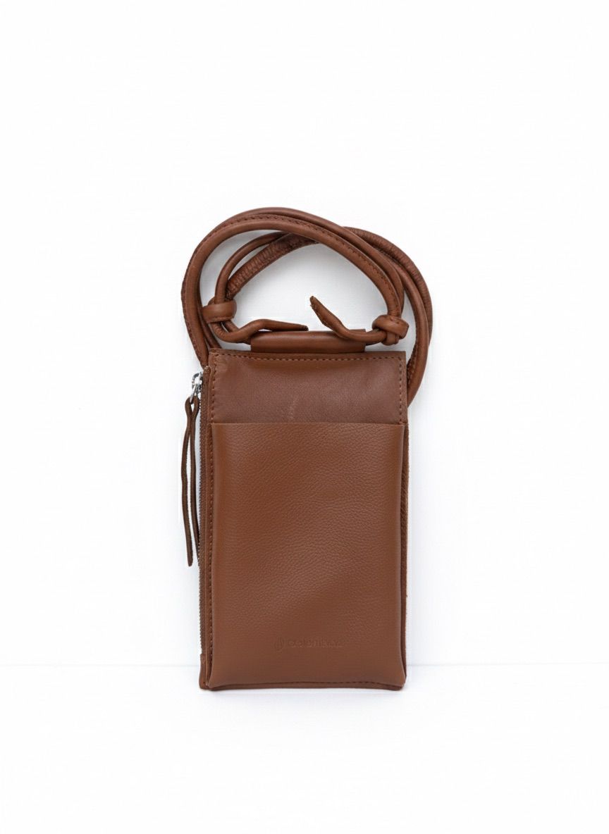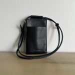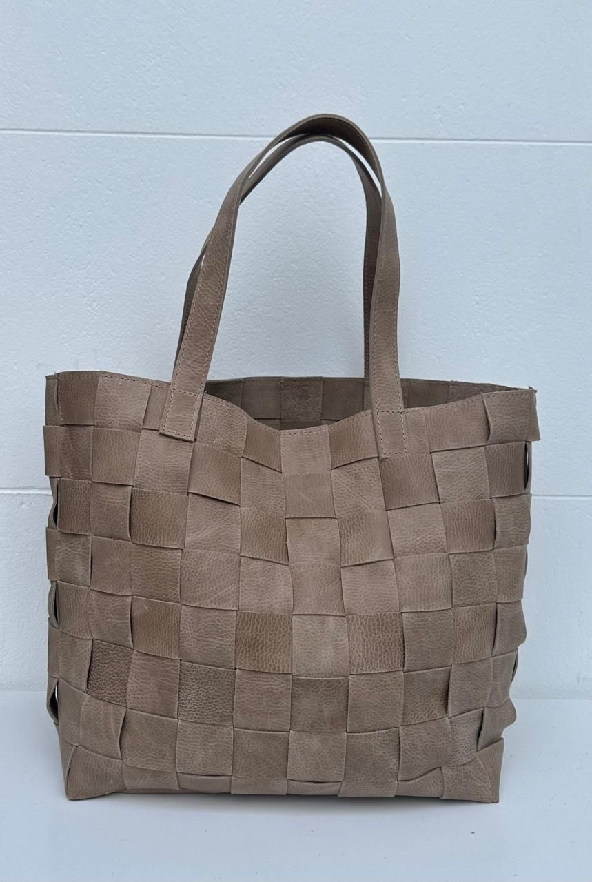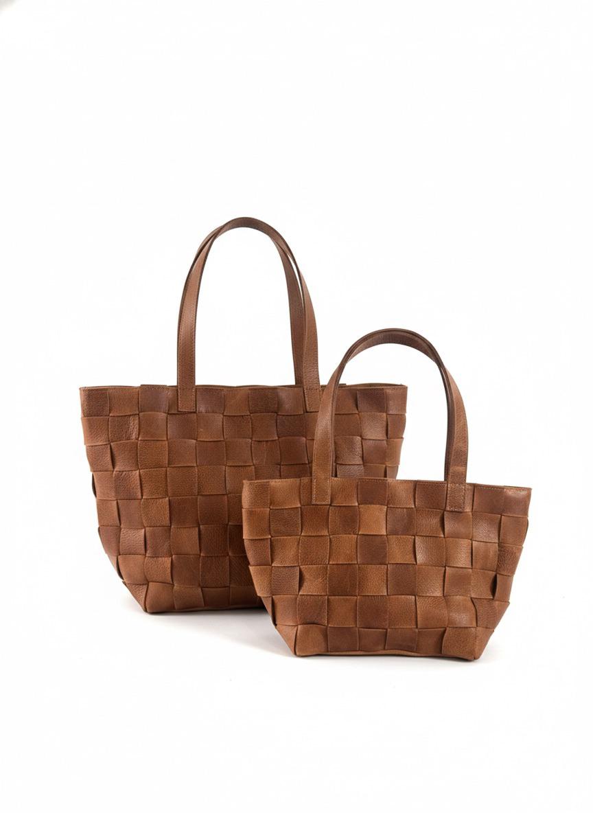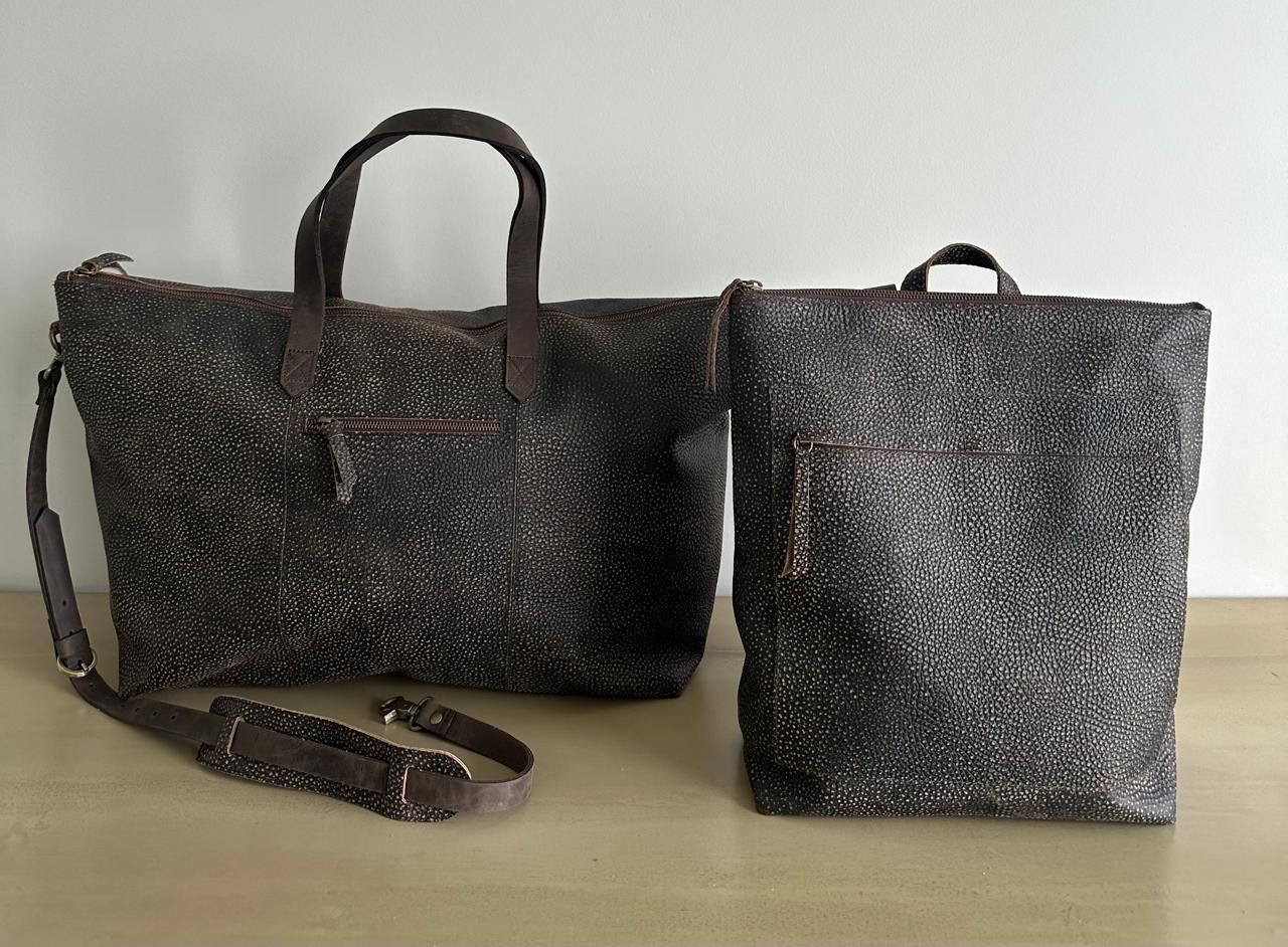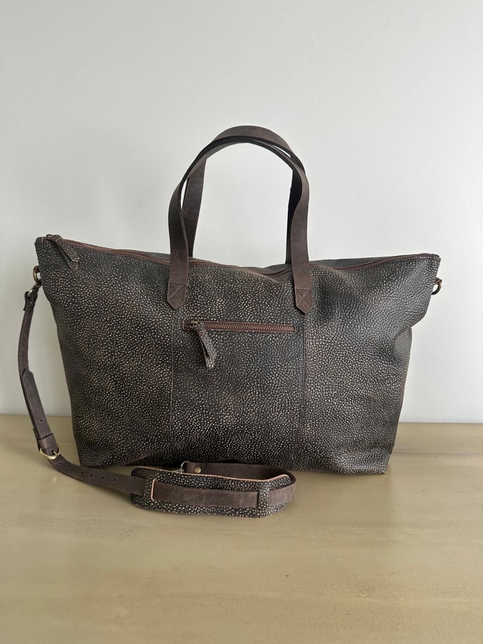 Bolso de cuero graneado forrado con tela Panama. Dos bolsillos interiores y un bolsillo exterior con cierre. Manijas cortas y correa regulable para llevar al hombro.