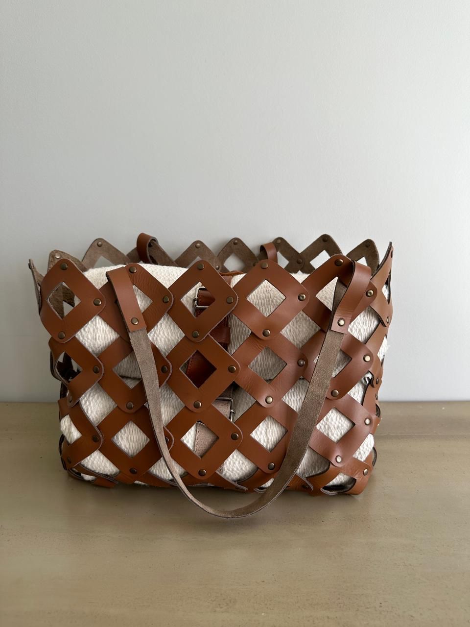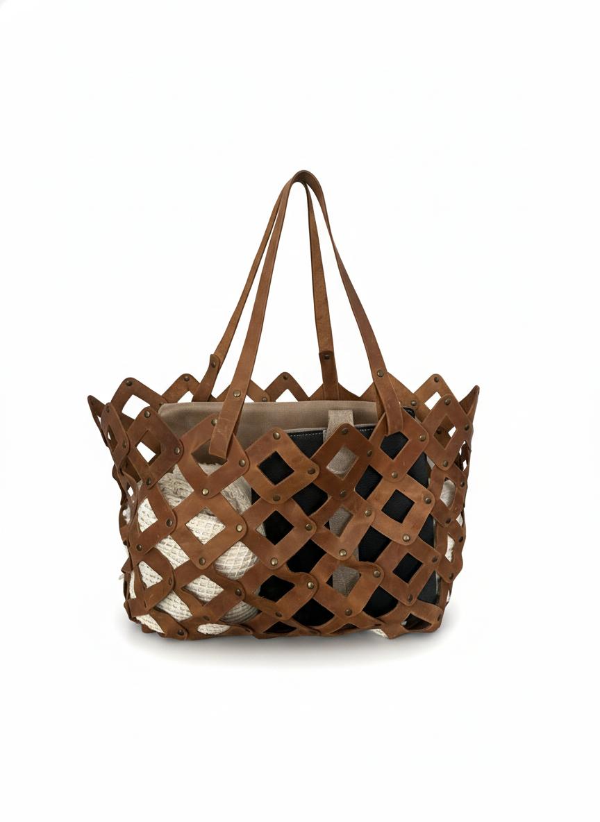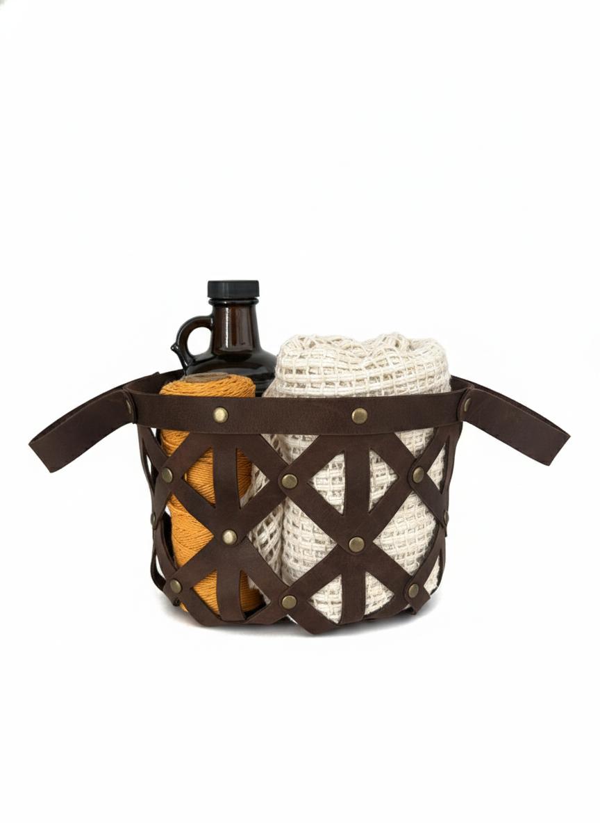 Canasta de cuero sin costura con sistema de encastre y remaches en color bronce viejo.