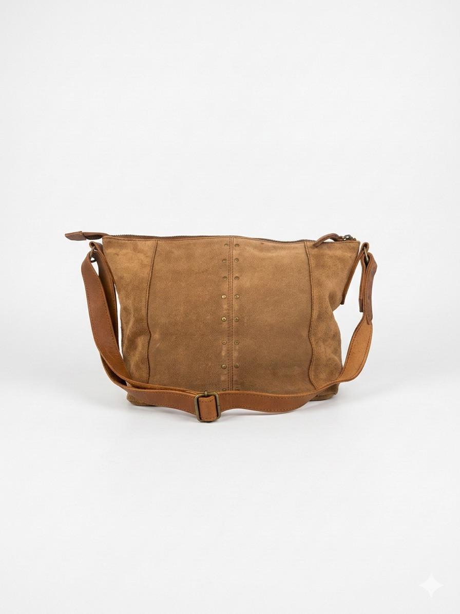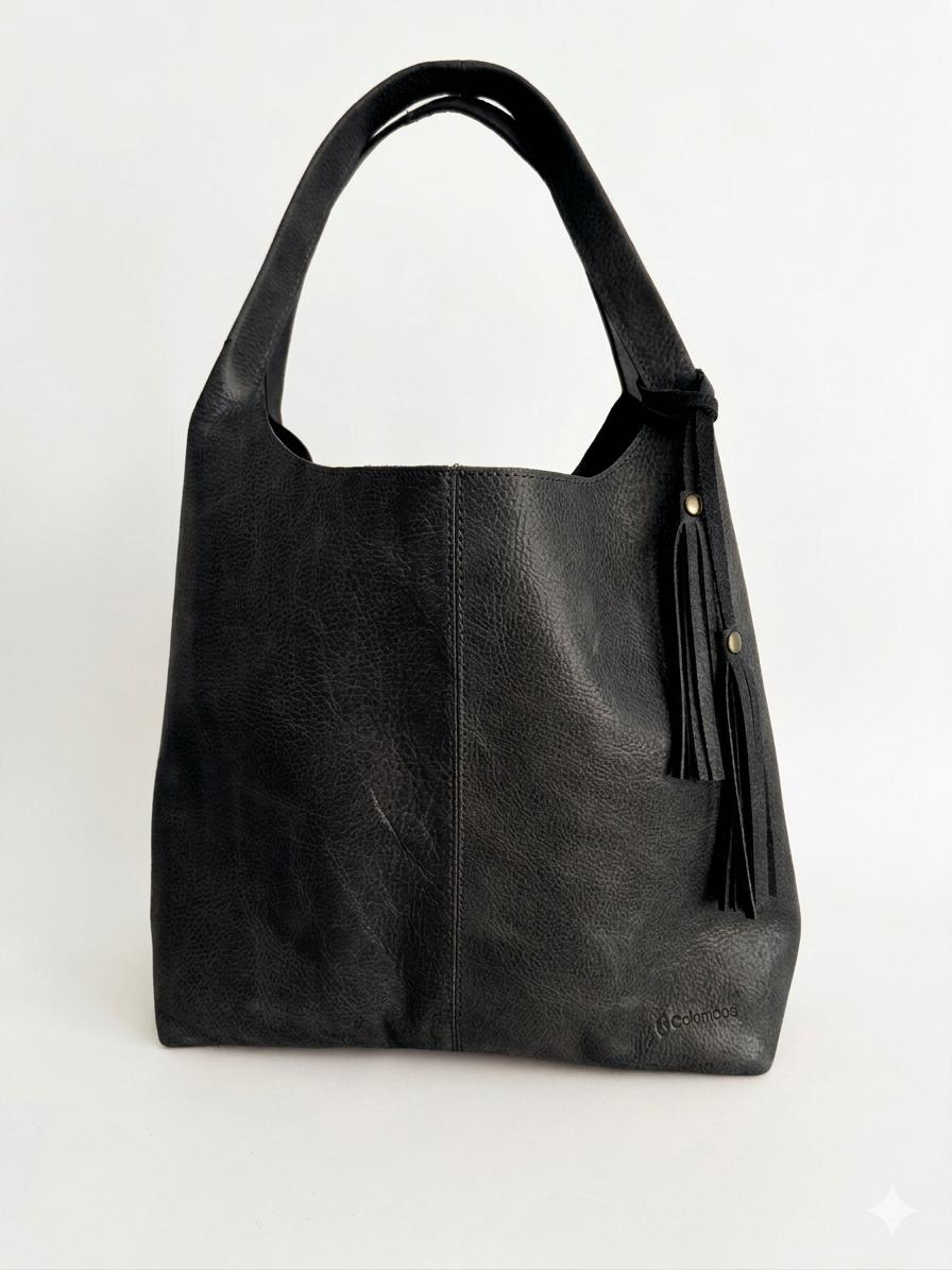 Cartera de cuero graneado con detalle de costura en el frente y tira con dos pompones colgando. En su interior posee un bolsillo con mosqueton. Amplio fuelle.