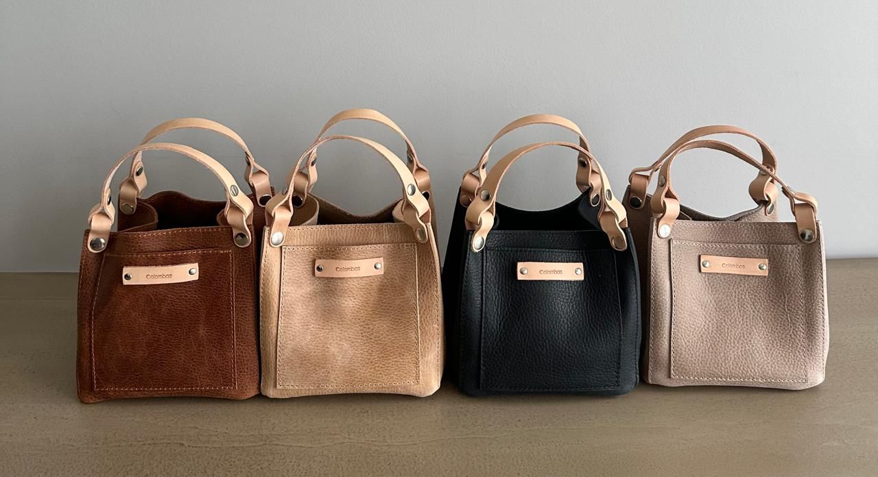 Contenedor en forma de cubo con un bolsillo exterior. Su base es de cuero graneado y las manijas de vaqueta.