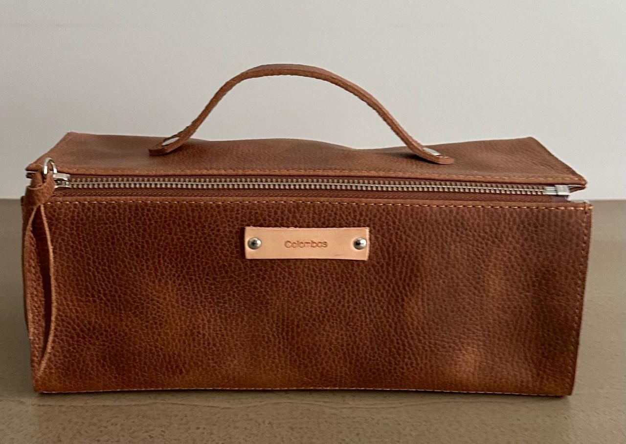 Neceser de cuero graneado con manija para poder llevarlo. Tiene un cierre desmontable que te permite abrirlo en su totalidad. En su interior esta forrado.