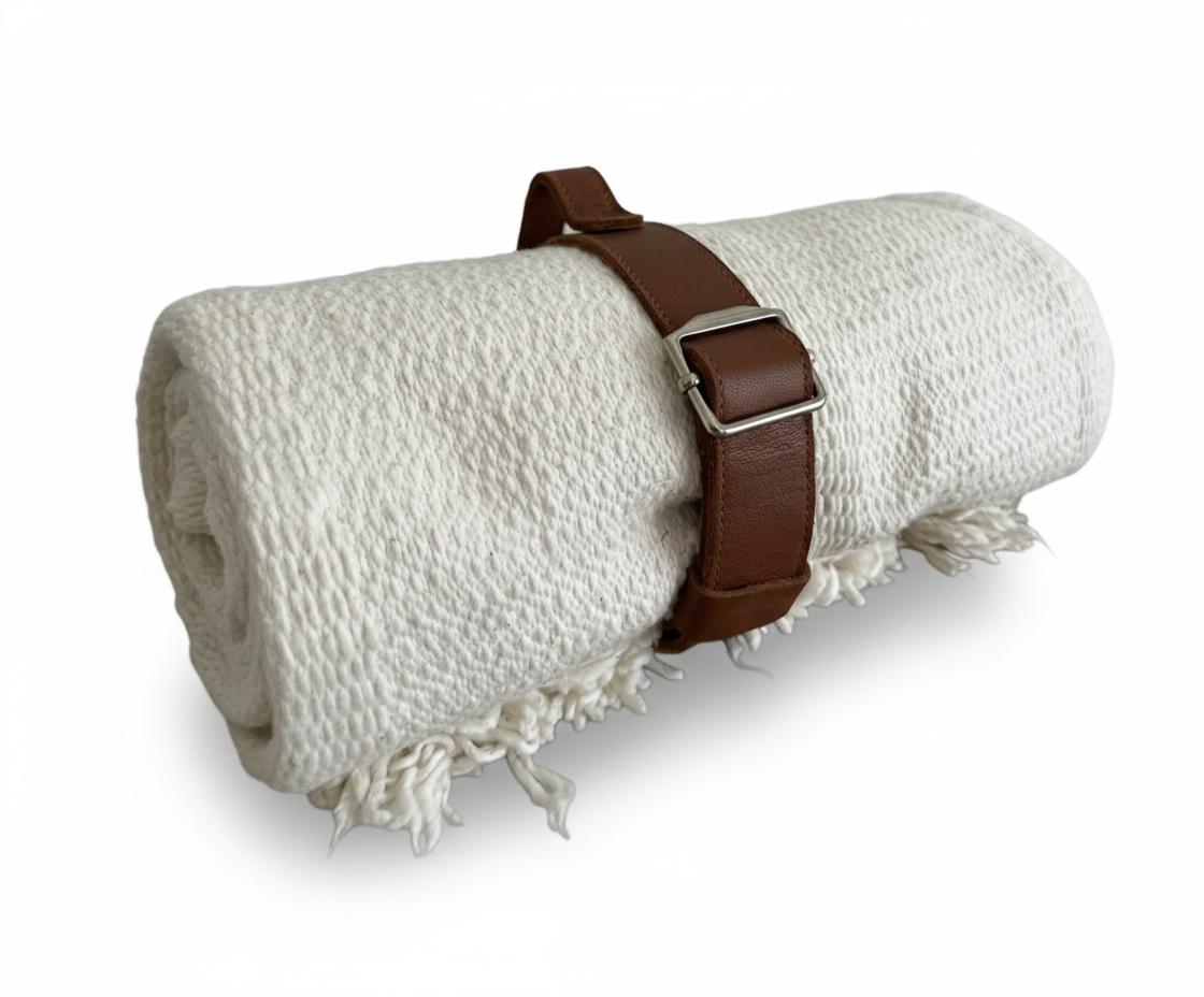 Tira contenedora regulable de cuero vegetal y cuero graneado con una hebilla niquel, ojalillos y una manija para poder transportarla.