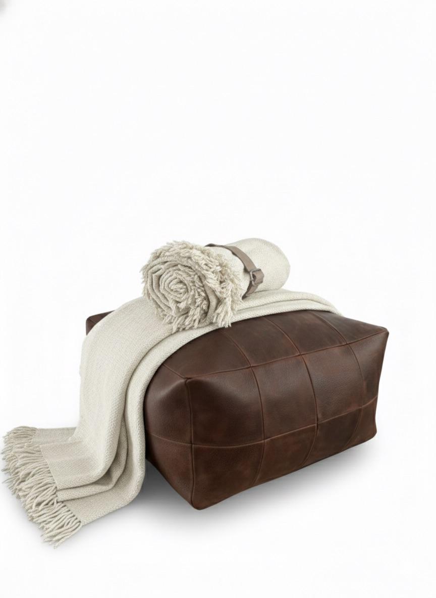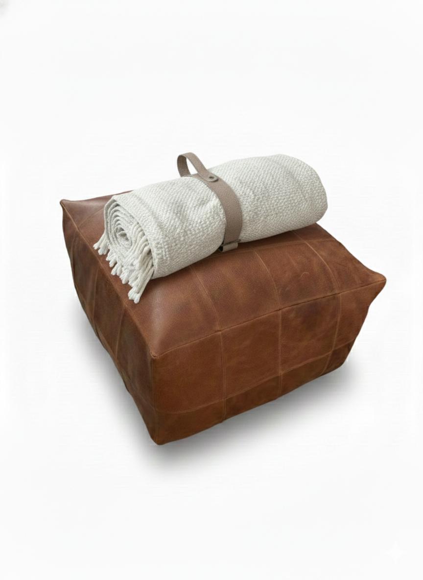 Puff realizado con cuadrados de cuero graneado.